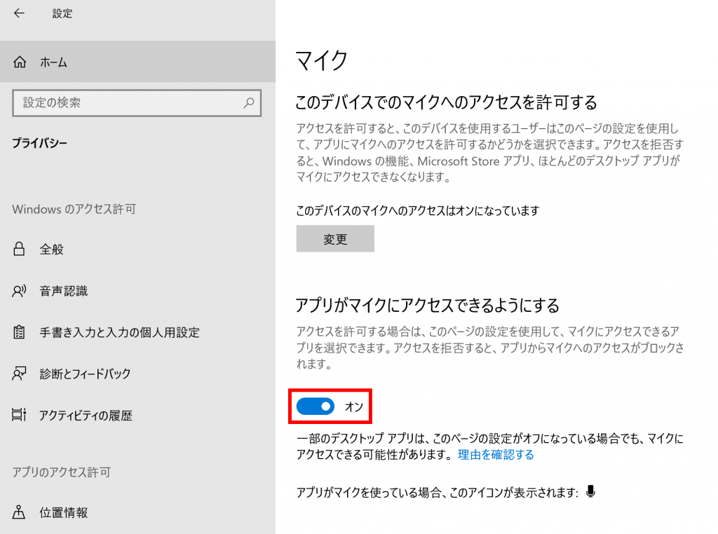 「アプリがマイクにアクセスできるようにする」をオン