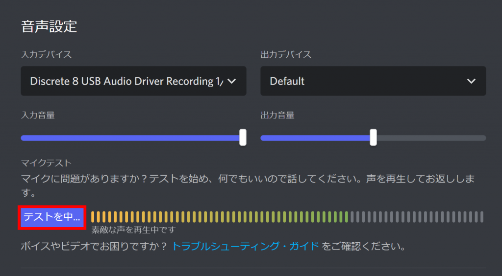 Discordに戻り音声設定欄の「確認しまし…」をクリックし音声が入っているかを確認しましょう。