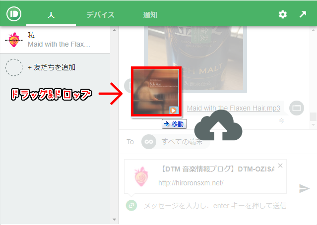 同じ様にブラウザのPushbulletへ画像や音楽データをドラッグ&ドロップ。たったこれだけでスマホへ送信されます。