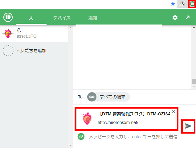 ブラウザ右上のPushbulletアイコンを押すと、現在開いてるページリンクが表示されます。右の矢印アイコンをクリック。