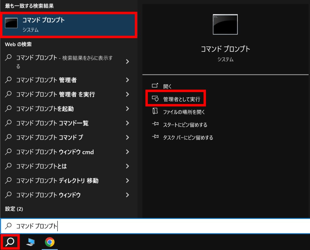 デスクトップ下の虫眼鏡マークで「コマンド プロンプト」と入力⇒「管理者として実行」