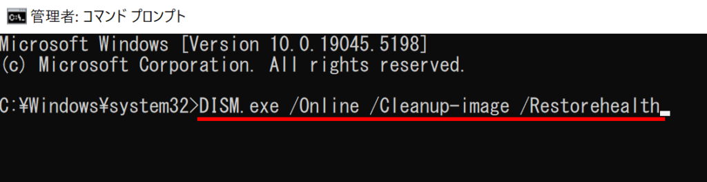 Windows\system32>の後に『DISM.exe /Online /Cleanup-image /Restorehealth』と入力しEnter。