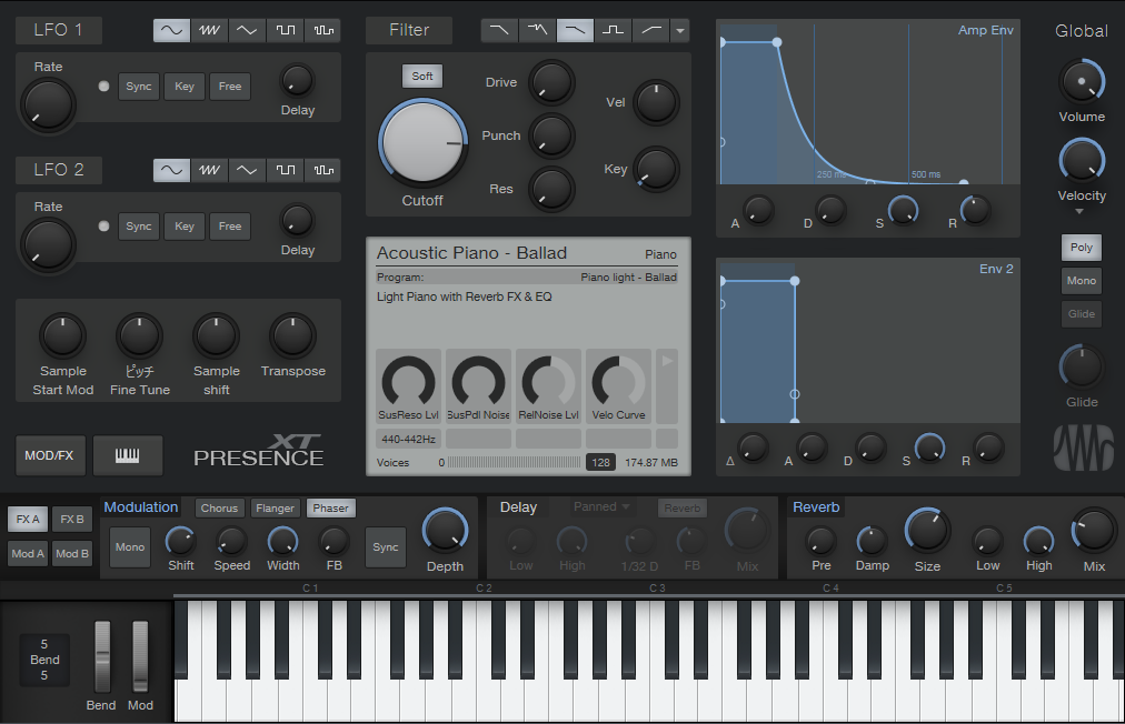 先ずはStudio One3に内蔵されている総合音源サンプラー「PRESENCE XT」のAcoustic Piano。