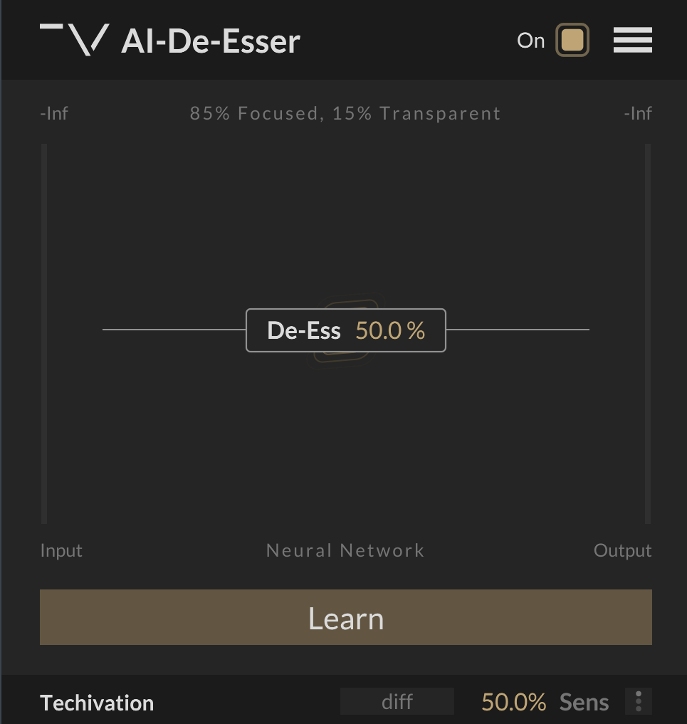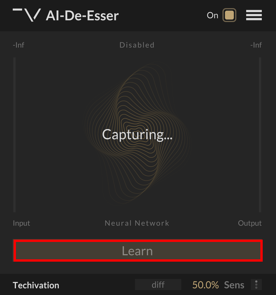操作はとても簡単で、素材を再生させながら”Learn”ボタンを押すだけでプラグイン内部でシビラント(歯擦音)を感知しオートで設定をしてくれます。約4秒間で終了。