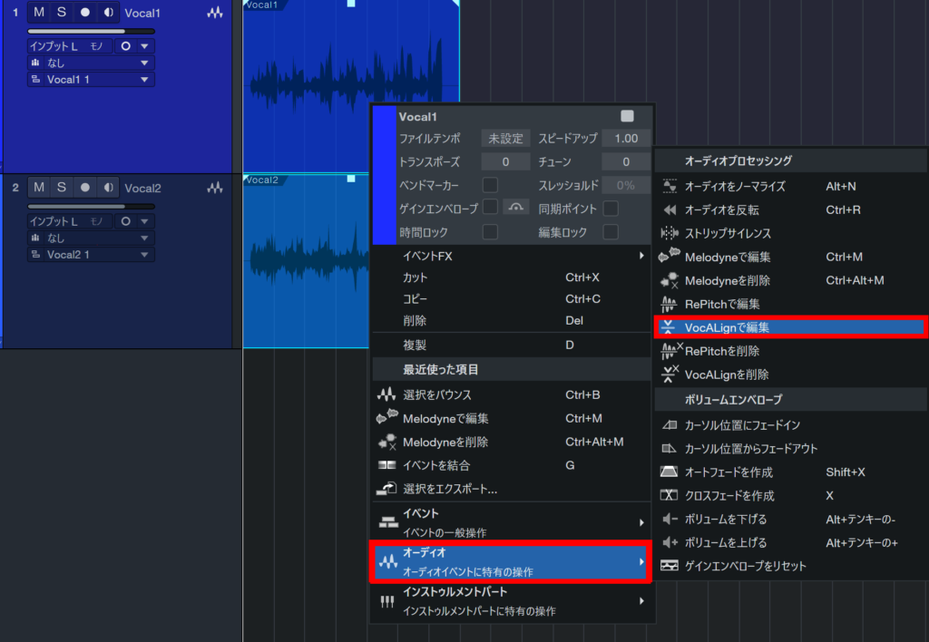 トラックを選択し右クリック⇒『オーディオ』⇒『VocALignで編集』でVocALignを立ち上げます。
