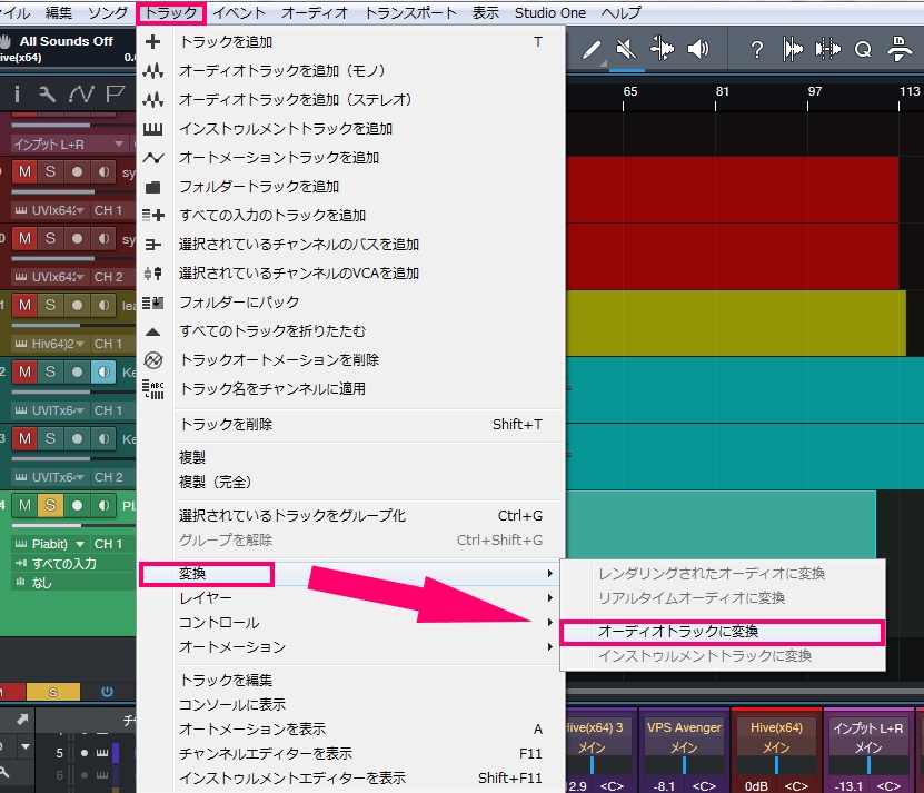 「トラック」→「変換」→「インストゥルメントトラックに変換」をクリック。