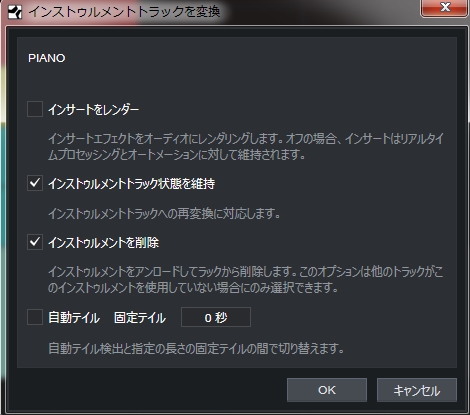 ・インストゥルメントトラック状態を維持・・・後からMIDIへ再変換できます。チェックを入れておきましょう。