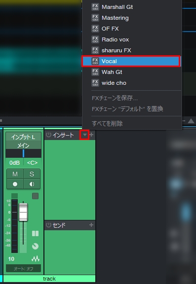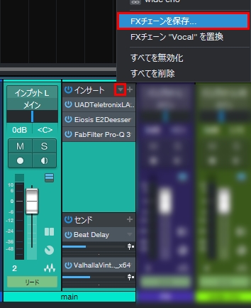 トラックに何かしらプラグインが挿さっている状態で「インサート」の右隣の「▼マーク」をクリック。するとプリセット一覧が開くので下の方にある「FXチェーンを保存」を選択。