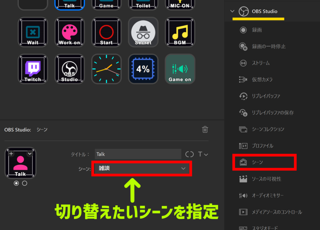 STREAM DECK上の『OBS Studio』➜『シーン』に割り当てたいシーンを選択、これだけで簡単にシーン切り替えが可能になります。