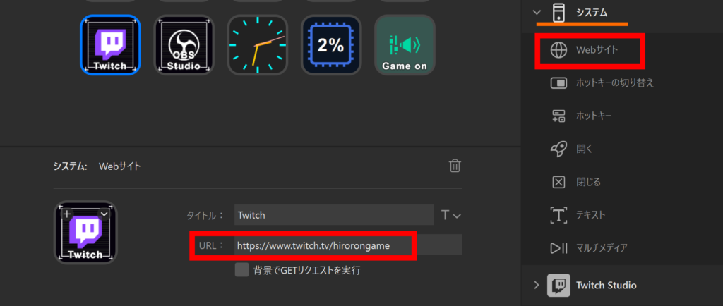 STREAM DECK上の『システム』➜『Webサイト』を選択、指定のURLを入力したら完了です。