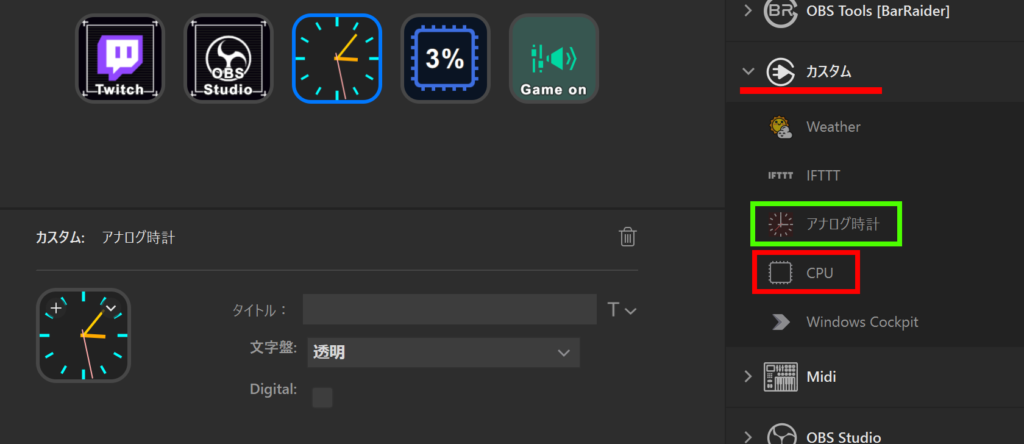 STREAM DECK上の『カスタム』➜『アナログ時計』、『CPU』を選択。